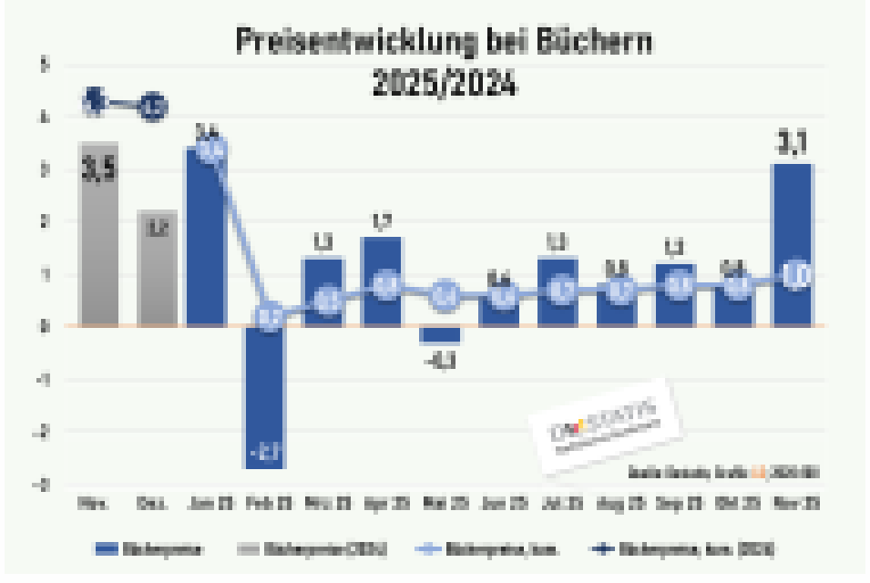 In den Erhebungen des Statistischen Bundesamts (Destatis) hat die Preisentwicklung bei Büchern im November einen überraschenden Sprung nach oben getan und verzeichnet den zweithöchsten Zuwachs dieses Jahres. …