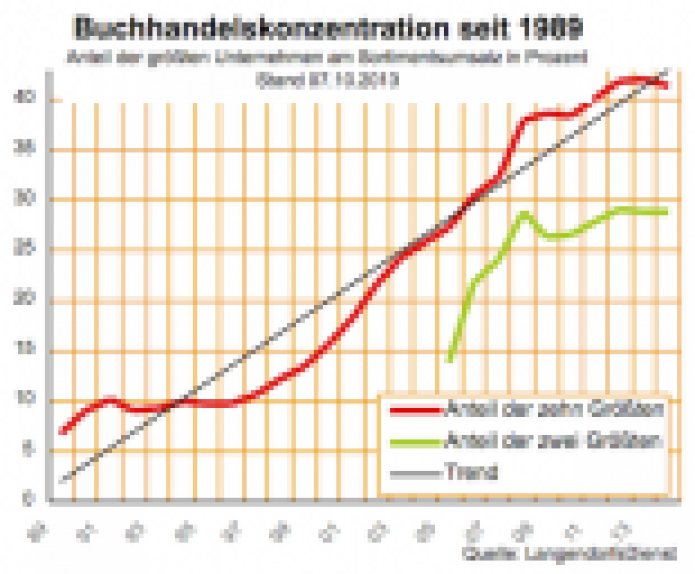 Die konsequenten Filialschließungen der großen Buchhandelsplayer zeigen jetzt erste Spuren im LD-Konzentrationsindikator (LKI), denn der Anteil der größten stationären Unternehmen am Branchenumsatz geht gegenüber dem letzten Status zur Jahresmitte (LD vom 13.06.2013) erstmals nach Jahrzehnten sichtbar zurück: …