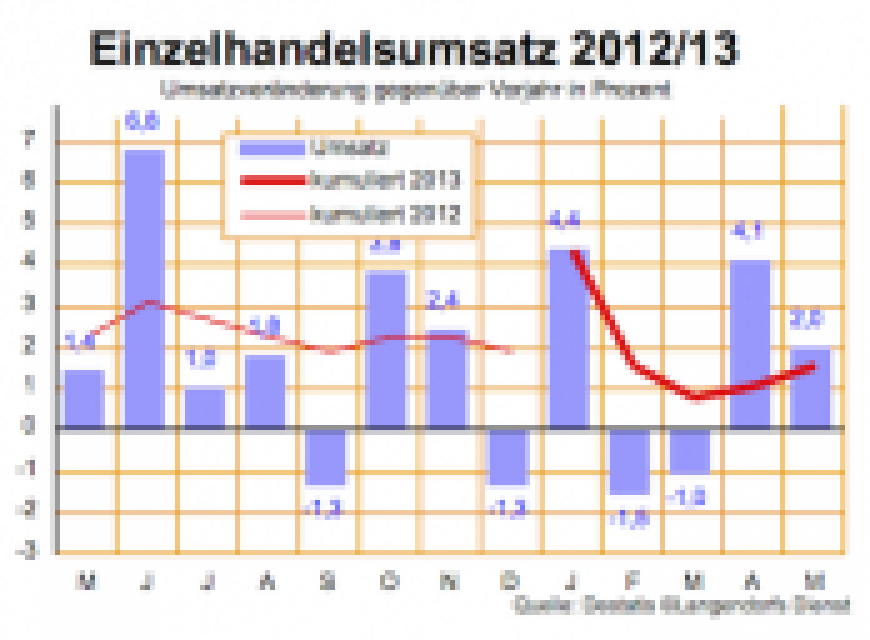 Die detaillierte Statistik zu den Einzelhandelsumsätzen im April (LD vom 24.06.2013) hat nach mageren Vormonaten auch dem Internet- und Versandhandel wieder einen Umsatzzuwachs in früher gewohnten Höhen bescheinigt. Nach Angaben des Statistischen Bundesamts legte der Versandhandel insgesamt beim Umsatz gegenüber dem Vorjahr um 18,5 Prozent zu, der Textilversand sogar um 32,5 Prozent, der Versand sonstiger Waren dafür nur um 10,3 Prozent. …