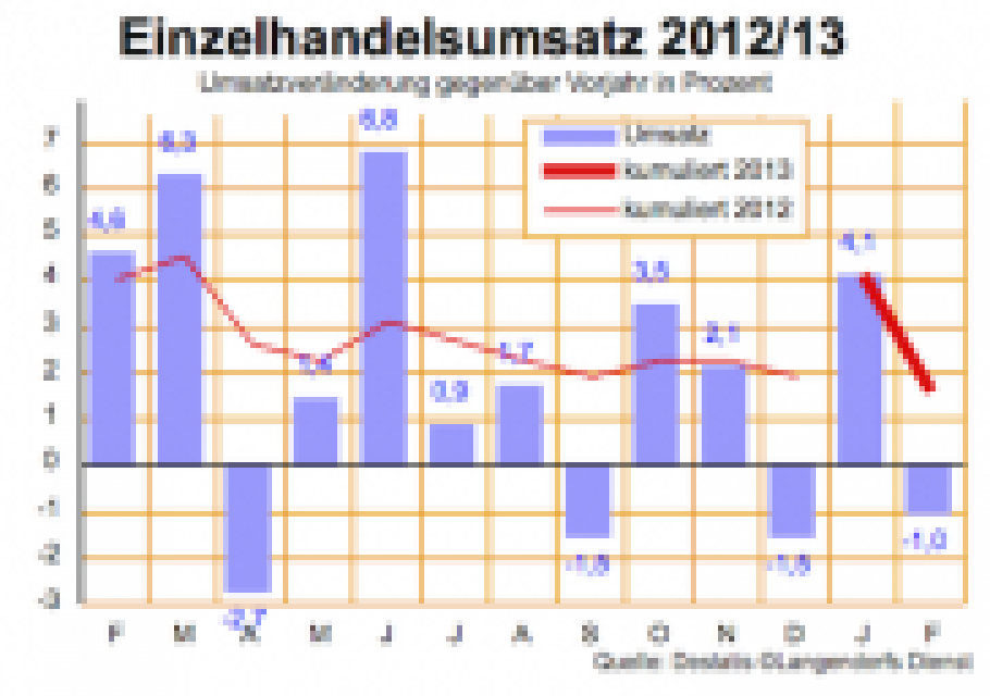 Der deutsche Einzelhandel hat im Februar nominal 1,0 Prozent (real 2,2 Prozent) weniger umgesetzt als ein Jahr zuvor. Das meldet heute das Statistische Bundesamt. …