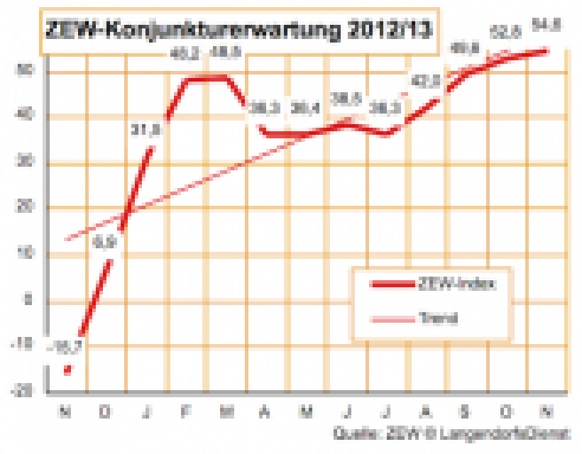 "Zuversicht wächst weiter" titelt das ZEW die Meldung über seinen Konjunkturerwartungs-Indikator, der auf einer Umfrage unter 285 Finanzexperten beruht. Im November steigt dieser Wert für Deutschland von plus 52,8 auf plus 54,6 Prozentpunkte: So groß ist jetzt der Abstand zwischen den Anteilen von Analysten mit positiver und solchen mit negativer Konjunkturerwartung. …