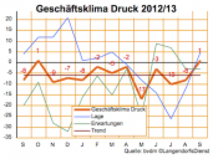 Das Geschäftsklima der deutschen Druckindustrie hat sich im September gebessert. Der Branchenverband bvdm meldet einen Indikator, der sich von minus 8 Punkten im August auf plus 1 knapp in den positiven Bereich vorgearbeitet hat. Letztmals war die Stimmung der Druckindustrie im Oktober 2012 ebenso knapp positiv, davor aber auch lange nicht. …