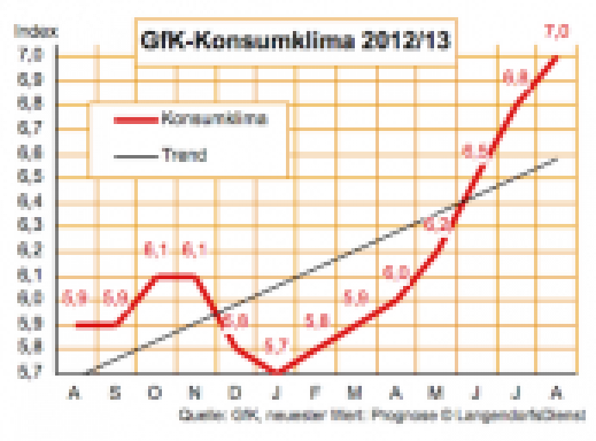 Unablässig neue Höchststände zeigt das Konsumklima an, das die GfK heute für Juli und August in Zahlen gefasst hat: …