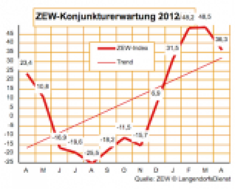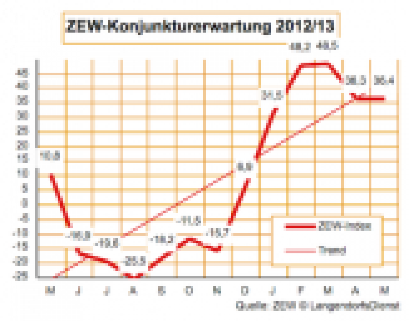 Schwächer als im Vormonat, aber immer noch gut zeigen sich die Konjunkturerwartungen, die das ZEW bei 243 Finanzexperten im April abgefragt hat. Angesichts rundum leicht rückläufiger Fundamentaldaten und Prognosen sowie der anhaltend verunsichernden Nachrichten im Zusammenhang mit Zypern liegt der Rückgang um 12,2 auf plus 36,3 Punkte im Rahmen des Erwartbaren. …