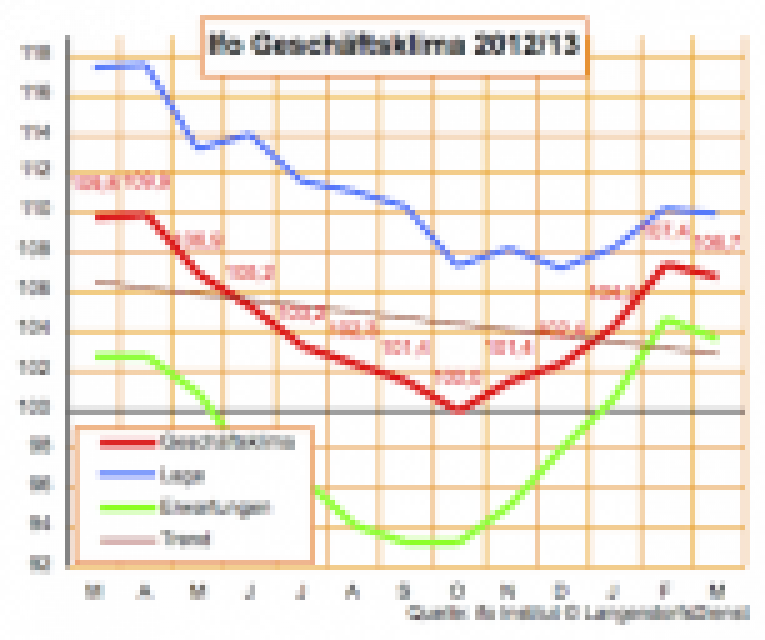 Die Experten hatten einen kleinen Anstieg erwartet, und der Börsenindikator DAX zeigte sich dementsprechend einen Wimpernschlag lang enttäuscht, als das Ifo-Institut vorhin meldete, dass der Geschäftsklimaindex für die gewerbliche Wirtschaft Deutschlands im März gesunken ist. In Wirklichkeit zeigt aber der geringfügige Rückgang von 107,4 auf 106,7 Punkte nach den kräftigen Anstiegen der Vormonate eine erfreuliche Solidität im Befinden der deutschen Unternehmen an. …