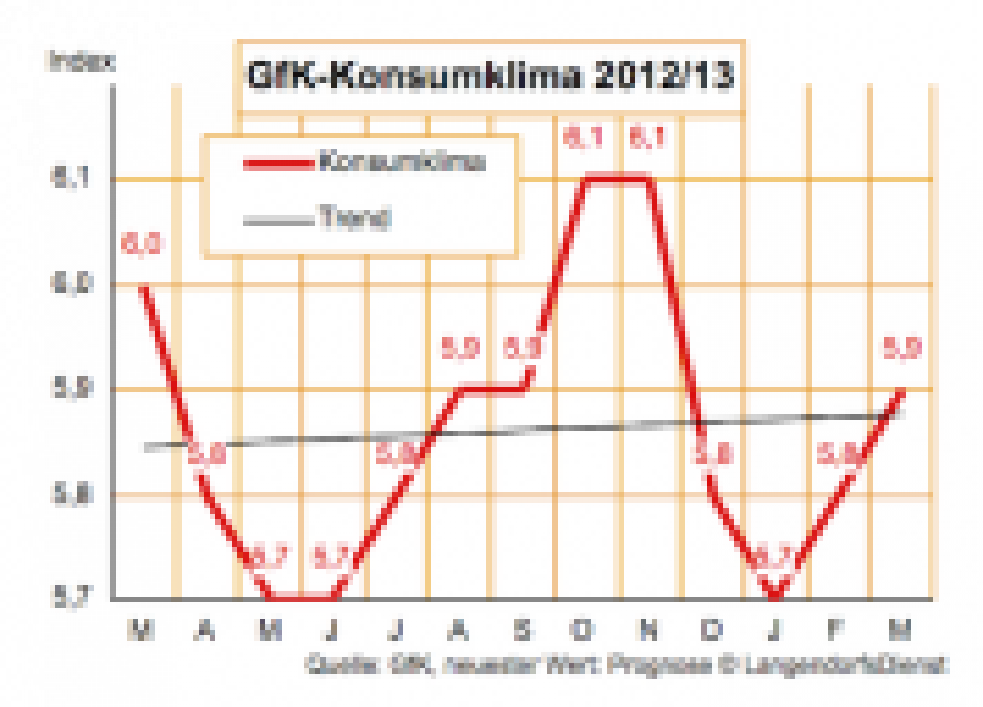 "Der Start des Konsumklimas in das Jahr 2013 ist gelungen", freut sich die GfK, deren Konsumklimaindex für Februar und März immer optimistischer werdende Verbraucher verheißt: …