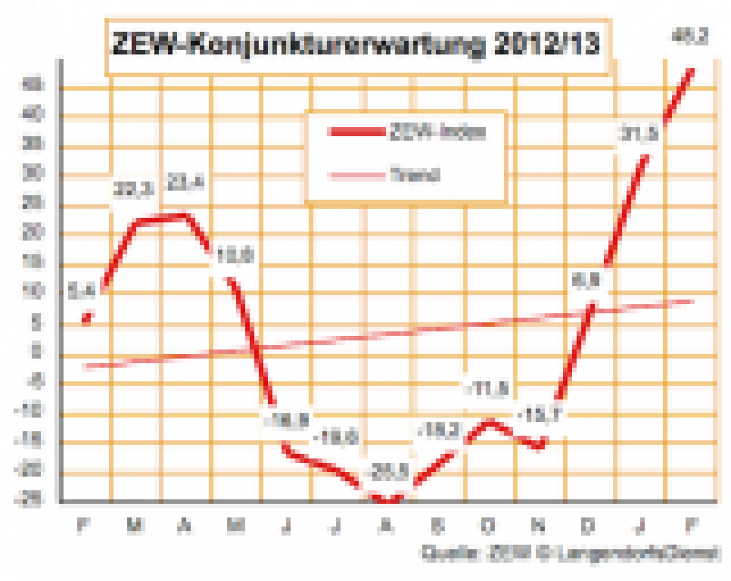 Mit dem Aufschwung um gleich 16,7 auf 48,2 Punkte übertreffen die ZEW-Konjunkturerwartungen der Finanzexperten selbst die hohen Erwartungen der Beobachter. Das geht aus dem Ergebnis der ZEW-Umfrage unter 272 Analysten hervor, die dem scheidenden Institutspräsidenten Wolfgang Franz damit zum Abschied eine Freude gemacht haben dürften. …
