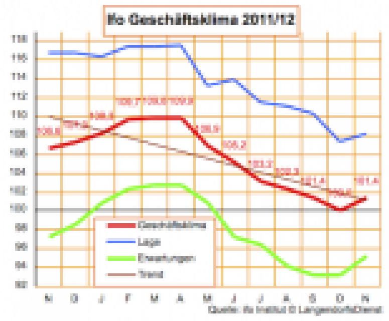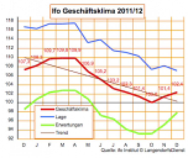 Die fundamentalen Probleme sind noch längst nicht aus der Welt, aber die Angst weicht und die Zuversicht in den Unternehmen wächst. Den Eindruck vermittelt der Ifo-Geschäftsklimaindex, der im Dezember weiter steigt, nämlich von 101,4 im November auf jetzt 102,4 Punkte. …