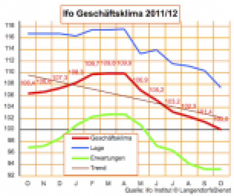 Der Ifo-Geschäftsklimaindex sinkt im Oktober um 1,4 Punkte. Das ist an sich nicht weltbewegend, aber immerhin der sechste Abstieg in Folge, und es trifft genau den Indexstand 100, den Durchschnitt des Jahres 2005. In den letzten Monaten hatte der Index stets deutlich über 100, vor anderthalb Jahren sogar um die 115 gestanden. …