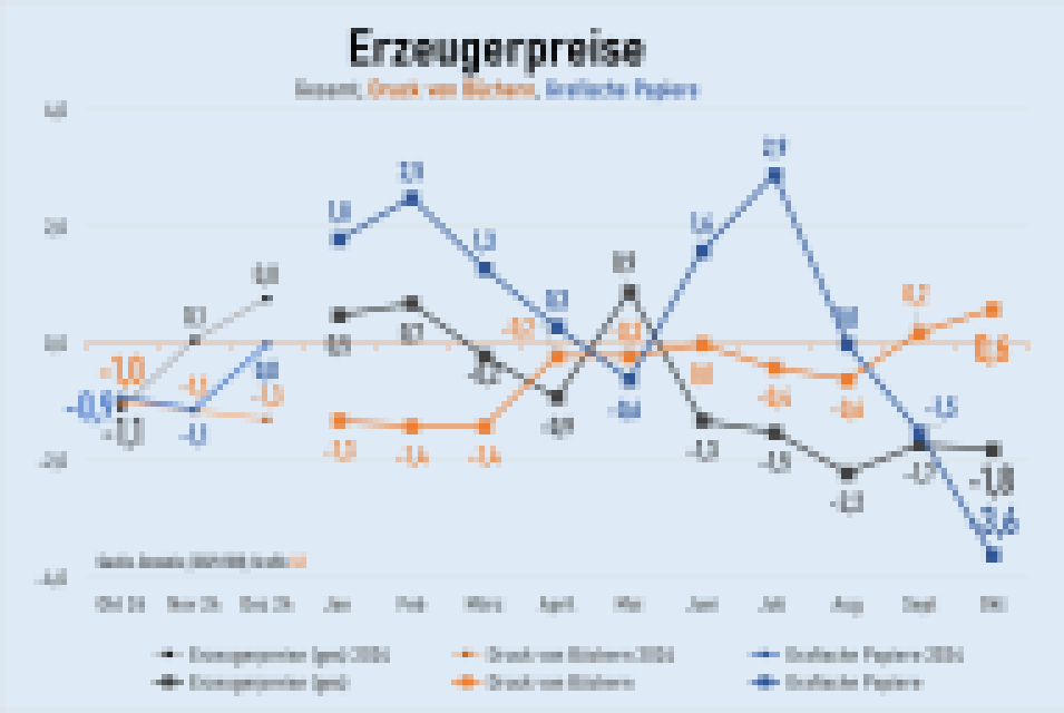 Die Preise für grafische Papiere sind im Oktober noch kräftiger abgesackt und gaben so stark nach wie seit dem August letzten Jahres nicht mehr. Dagegen verstärkt sich der Anstieg der Buchdruckkosten leicht. Das ist den Daten zu den Erzeugerpreisen zu entnehmen, die das Statistische Bundesamt (Destatis) heute veröffentlicht hat. …